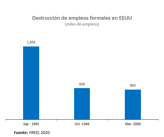 De hecho, mes a mes la mayor destrucción de empleos se dio en 1945, y apenas e destruyeron alrededor de 1.9 millones de empleos en el mes de septiembre. Le siguen fechas como octubre de 1949 (con una destrucción de empleos de 838 mil puestos), y en general la crisis de hace una década, que en su punto más álgido llegó a tener una destrucción de empleos de 800 mil puestos en marzo de 2009.