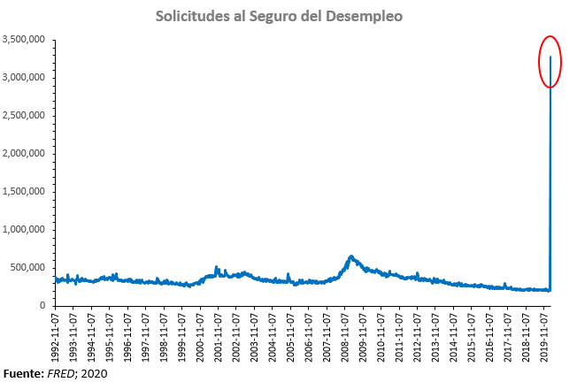La gráfica prácticamente se explica por si sola. Las solicitudes al seguro de desempleo, que son el número de personas que acuden para pedir al gobierno dinero por estar desempleado, saltaron de 282 mil solicitudes que había la semana pasada a 3.28 millones. Es la cifra más alta de la que se tenga registró alguno desde 1967, y no tiene comparación con lo que sucedió en la crisis del 2001 o en la crisis de 2008.