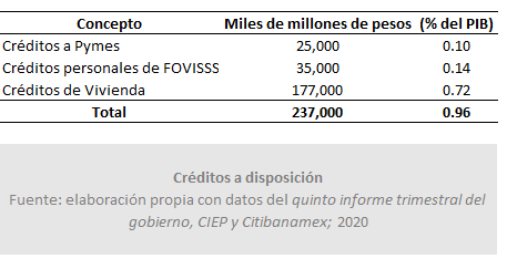 La gran innovación del gobierno por tanto no parece estar en el estímulo fiscal sino en la disposición de crédito que están emprendiendo. Para las pequeñas y medianas empresas se dará un millón de créditos (500 mil para el sector formal y 500 mil para el informal) por un monto de 25 mil millones de pesos. Es decir, que aún si todos los negocios usarán todos los créditos a disposición, apenas significaría un impulso de 0.1% del PIB.