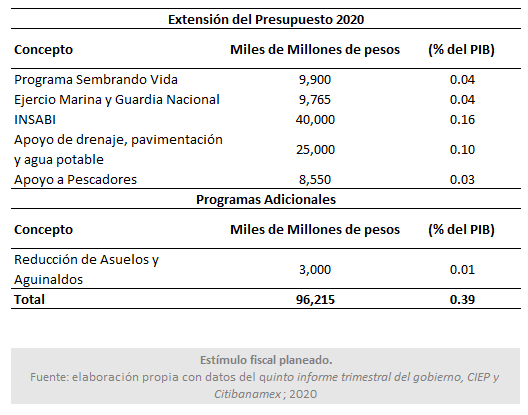 Esta medida generaría un ahorro de 3 mil millones de pesos, lo equivalente a casi el 0.01% del PIB. Asimismo, se amplió el presupuesto asignado a algunos programas para enfrentar la crisis como son el programa de “Sembrando Vida” (9 mil 900 millones de pesos adicionales); la contratación de elementos del ejército, marina y Guardia Nacional (9,765 mdp), y se crearon nuevos recursos para el Instituto de Salud para el Bienestar (INSABI) por 40 mmp, programas de agua potable, drenaje y pavimentación (25 mdp); y un programa de apoyo a pequeños pescadores por 8,550 millones de pesos.