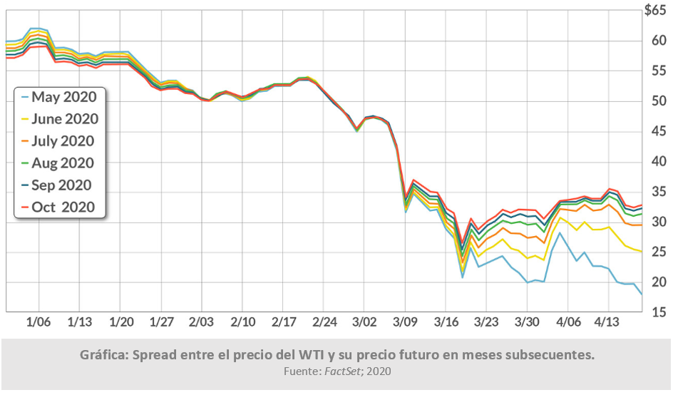 Una primera hipótesis sería que claramente el precio actual del crudo es demasiado bajo a consecuencia de la menor demanda de combustibles y energéticos que ha generado la pandemia del Coronavirus, y es tan bajo, que los futuros marcan que el precio deberá aumentar al futuro, y eso es lo que refleja el mercado: la expectativa de que el precio del crudo mejorará.